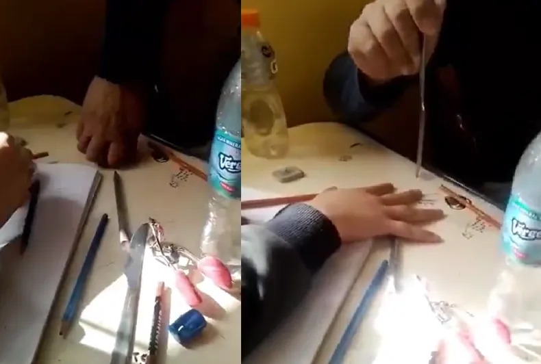 Según el relato de los padres, el docente tomó un cuchillo que pertenecía al almuerzo de una estudiante de 14 años y comenzó a "jugar" sobre su mano. El profesor intentaba simular el conocido "juego de la ruleta rusa", en el que se busca evitar pinchar los dedos, y el peligroso momento fue filmado por otro alumno.
