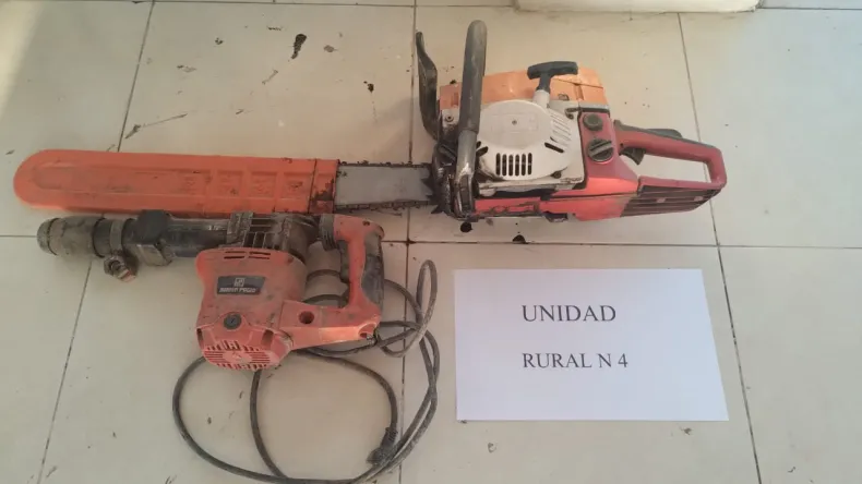 La Unidad Rural 4 "El Acequión" allanó un domicilio en el departamento Sarmiento y secuestró varios objetos, entre ellos, un roto martillo, una motosierra y una moto que tenía pedido de secuestro activo de la provincia de Me