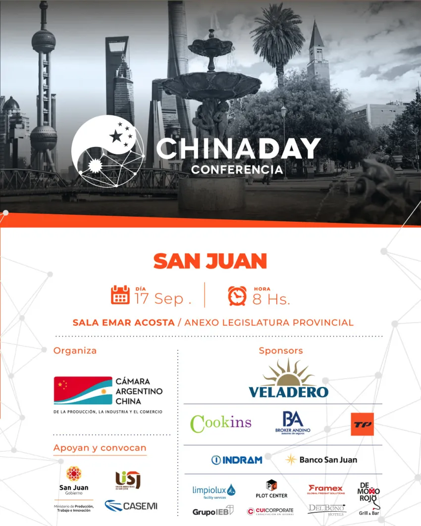 Con esta nueva edición, San Juan se posiciona como un escenario clave para el diálogo productivo y comercial, reforzando su perfil internacional y proyectando su potencial en minería, tecnología y agroindustria. Organizado por la Cámara Argentino-China cuenta como sponsor a Veladero y Broker Andino entre otras empresas con asiento en la provincia. Apoyan UISJ, CASEMI y Gobierno de San Juan.