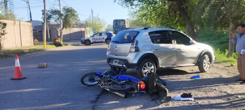 El accidente ocurrió este miércoles en la intersección de Mosconi Oeste y Chacabuco, cuando un Renault Sandero realizó un giro en "U" e impactó la moto.