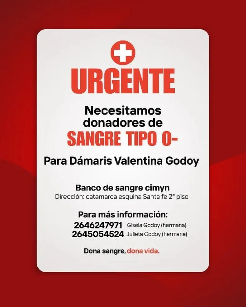 Quienes puedan colaborar deben dirigirse al Banco de Sangre del Cimyn, ubicado en Catamarca esquina Santa Fe, segundo piso. "Urgente necesitamos donadores de sangre tipo 0- para Dámaris Valentina Godoy en el banco de sangre del Cimyn", agrega el mensaje difundido por la familia.