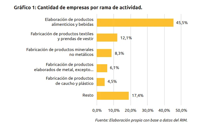 El relevamiento mostró que la industria manufacturera sanjuanina está fuertemente concentrada en pocas actividades. Según los datos, la Elaboración de productos alimenticios y bebidas representa el 45,5% del total de empresas, seguida por la Fabricación de productos textiles, prendas de vestir y calzado (12,1%) y la Fabricación de productos minerales no metálicos (8,3%).
