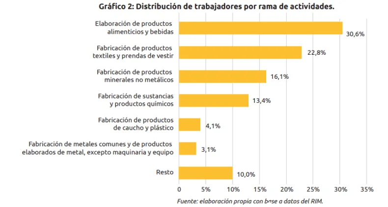 La concentración también se refleja en el aspecto laboral. La elaboración de productos alimenticios y bebidas emplea al 30,6% de los trabajadores, con fuerte incidencia de la vitivinicultura (38% del total de ese rubro) y de la producción de aceites vegetales (10%). Le siguen la fabricación de textiles, prendas y calzado con el 22,8%, y la fabricación de minerales no metálicos con el 16,1%, donde las empresas caleras absorben el 34% del personal.