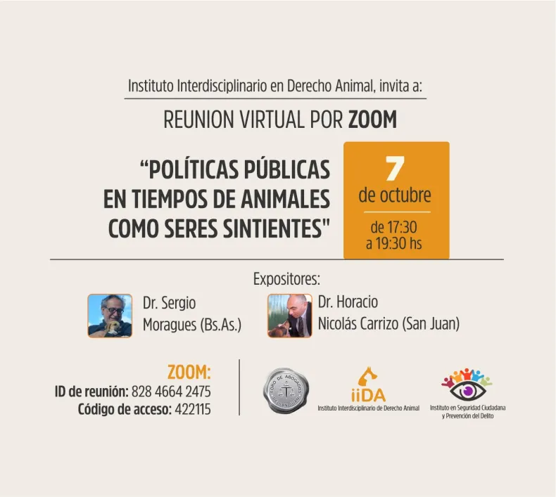 El próximo 7 de octubre, el Instituto Interdisciplinario en Derecho Animal (IIDA) invita a una charla virtual titulada "Políticas públicas en tiempos de animales como seres sintientes". Será de 17:30 a 19:30 horas por Zoom, y tendrá como expositores al Dr. Sergio Moragues (Buenos Aires) y al Dr. Horacio Nicolás Carrizo (San Juan), codirector del IIDA y referente local en la materia.