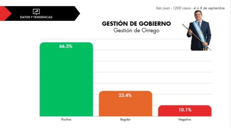 Según un sondeo de Datos y Tendencias, el candidato X por San Juan, encabeza la preferencia con el 38,7% y se perfila como favorito para las elecciones legislativas. La gestión de Orrego alcanza un 66,5% de aprobación.