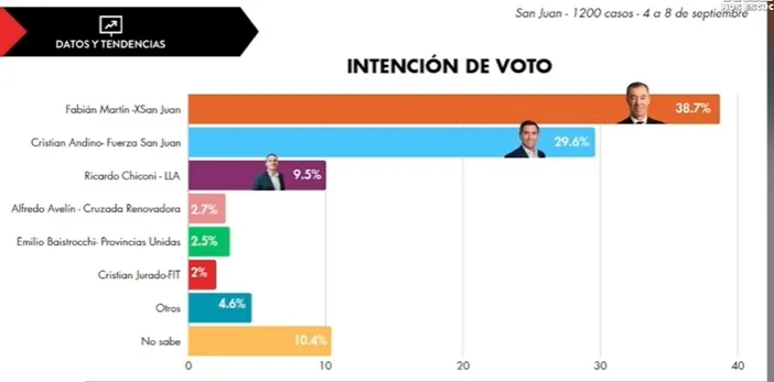 El estudio, basado en 1200 casos presenciales realizados entre el 24 y 27 de septiembre en toda la provincia, arrojó que Martín concentra un 38,7% de intención de voto, seguido por Cristian Andino de Fuerza San Juan con 29,6%.