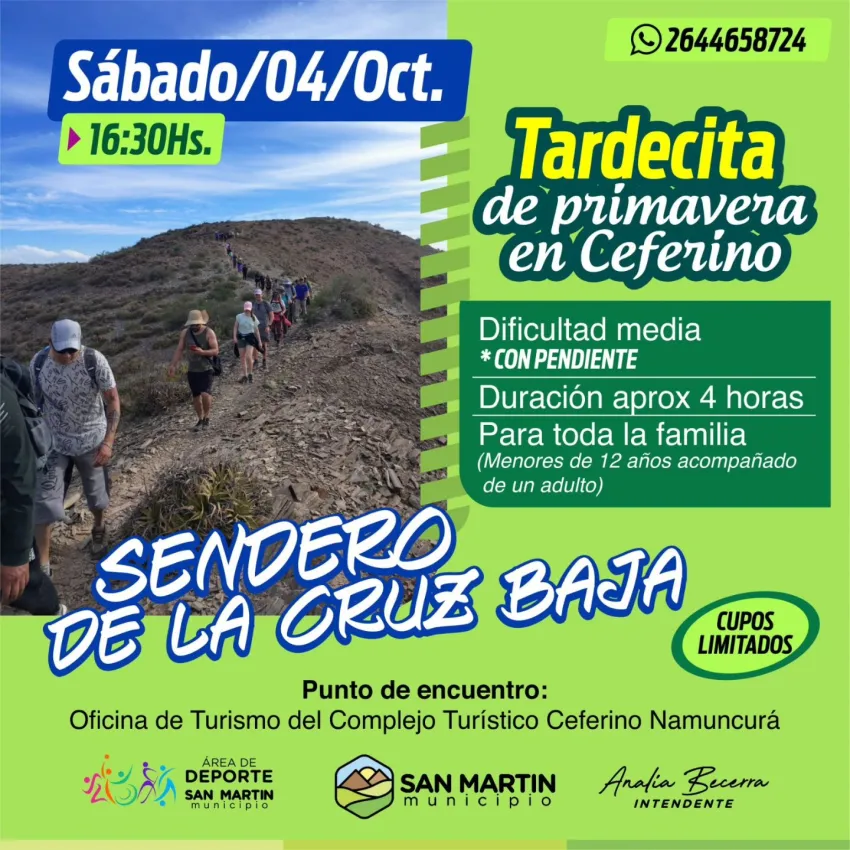 Este sábado 4 de octubre, a partir de las 16:30, se realizará la caminata por el Sendero de la Cruz Baja, un recorrido de dificultad media con pendiente, pensado para disfrutar en familia y en contacto con la naturaleza. La actividad tendrá una duración aproximada de cuatro horas y está abierta a todas las edades (los menores de 12 años deberán estar acompañados por un adulto).