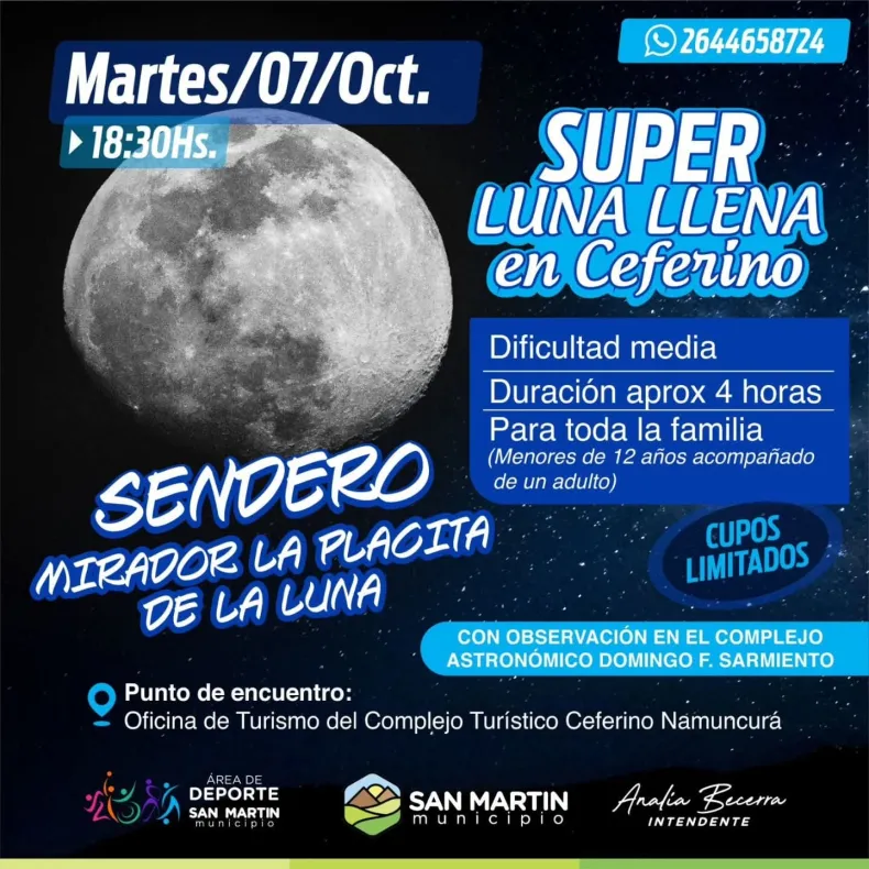 La Municipalidad de San Martín invita a una experiencia de senderismo nocturno para disfrutar de la Súper Luna Llena. La actividad se realizará este martes 7 de octubre a las en el Complejo Turístico Religioso Ceferino Namuncurá.
