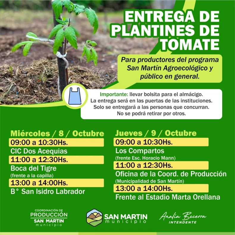 La Municipalidad de San Martín, a través de la Coordinación de Producción, realizará la entrega gratuita de plantines de tomate destinada a los productores del programa San Martín Agroecológico y al público en general.