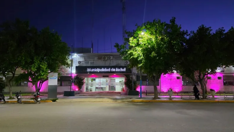 Con el objetivo de acompañar la campaña de lucha contra el cáncer de mama, la Municipalidad de Jáchal personalizó su edificio con iluminaria alusiva en tonos rosados,