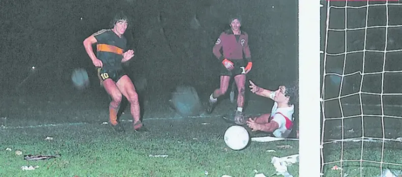 Ese viernes 12 de abril, comenzó el idilio entre Diego y la gente de Boca, idilio que tuvo su broche de oro con la consagración en el Metropolitano, en donde el Diego marcó 17 goles, pero el más importante, el que más se recuerda, lo anotó ante River aquella lluviosa noche de otoño en una Bombonera embarrada.