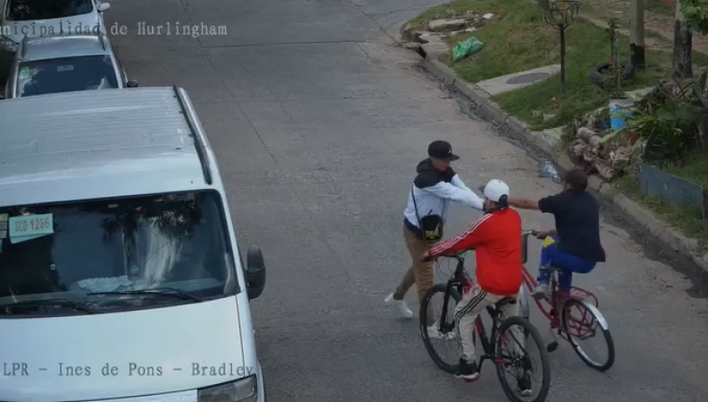 La escena ocurrió en la intersección de las calles Eduardo Bradley e Inés de Pons, en el límite entre Villa Tesei y El Palomar, donde los tres hombres fueron registrados por una cámara municipal en plena vía pública.