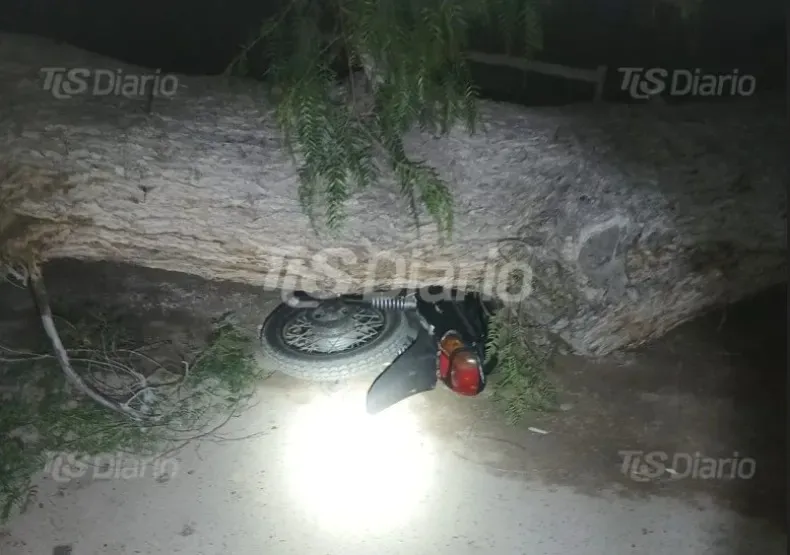 El viento Sur azotó con fuerza la provincia y en Ullum una joven estuvo a centímetros de morir aplastada por un enorme pimiento que cayó. La moto de la víctima quedó destruida bajo el árbol.