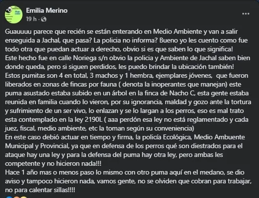 La reciente aparición de pumas en zonas rurales del norte de Jáchal ha causado alarma y controversia entre los habitantes de la región. En las últimas horas, la proteccionista Emilia Merino publicó en su cuenta de Facebook una acusación directa contra el personal de Fauna, señalando que ellos habrían liberado a cuatro ejemplares jóvenes — tres machos y una hembra — en terrenos de fincas habitadas.