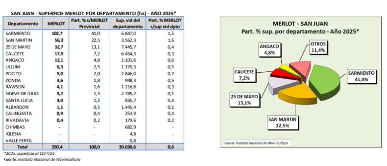 El informe del INV ubica a San Juan como la segunda provincia con mayor superficie cultivada de Merlot en el país, solo detrás de Mendoza. Según los datos de 2025, la provincia cuenta con 250,4 hectáreas implantadas, lo que representa el 6% de la superficie nacional de este varietal. En el contexto provincial, el Merlot ocupa el 0,6% de la superficie total de vid, consolidándose como un segmento pequeño pero de alto valor enológico. Mendoza concentra el 79,2% del Merlot argentino, con 3.294 hectáreas, pero el crecimiento sanjuanino marca una tendencia ascendente.