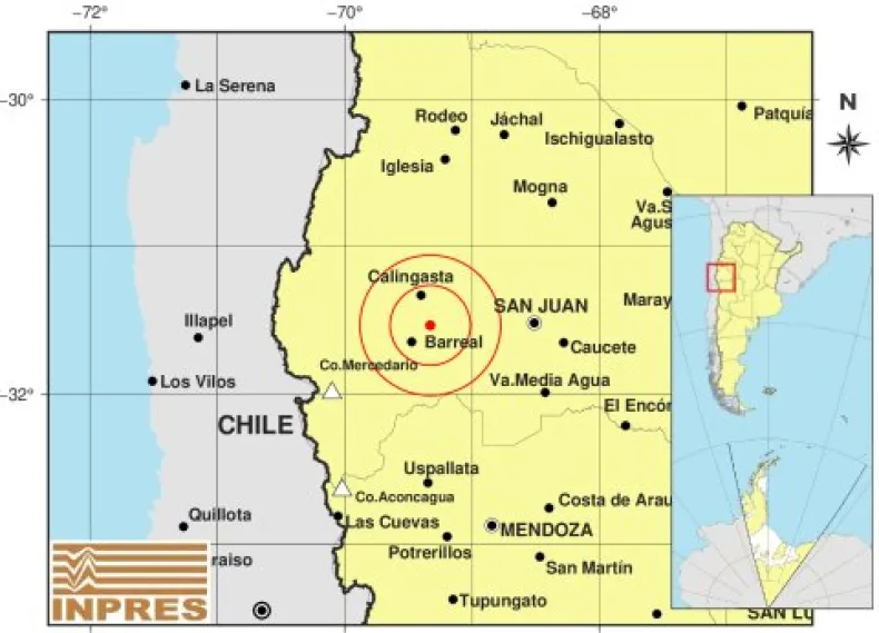 En las primeras horas de este domingo, un temblor de magnitud 3.5 se registró en la provincia de San Juan, según informó el Instituto Nacional de Prevención Sísmica (INPRES). El sismo ocurrió a las 4:37 de la madrugada y se localizó a 24 kilómetros al sur de Calingasta, 29 kilómetros al noreste de Barreal y 76 kilómetros al oeste de la ciudad de San Juan.