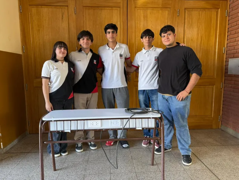 Uno de ellos fue el Banco Sustentable, un diseño que busca dar respuesta a una necesidad concreta dentro del aula: la falta de tomacorrientes para el uso de computadoras y celulares. "En 7mo somos 41 alumnos y solo tenemos cinco enchufes. Trabajamos con computadoras y celulares, y muchas veces no podemos usarlos por falta de carga", contaron los integrantes del equipo conformado por Camila Bordes, Ignacio Guzmán, Valentín Irazoque, Andrés Murua y Alfredo Olivares, junto a los docentes Daghero e Irusta, y los mentores Leticia Landazuri y Juan Cruz Bouyssede, del Grupo Santander.
