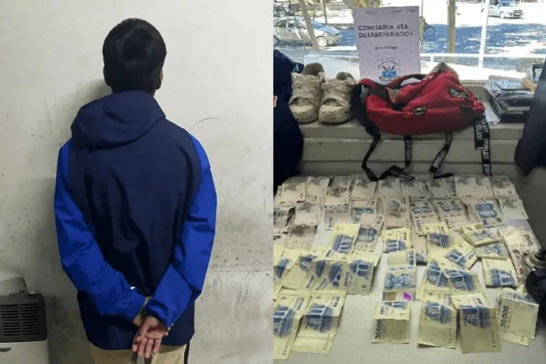 En la madrugada del lunes, un joven identificado como Vila, de 18 años, fue detenido en Capital llevando una mochila mojada con $1.370.000 en efectivo y varias prendas de vestir. Esta detención se produjo en inmediaciones de las calles Falucho y Matías Zavalla, luego de que una vecina alertara al 911 sobre ruidos sospechosos en el techo de su casa, ubicada en el barrio 25 de Mayo.