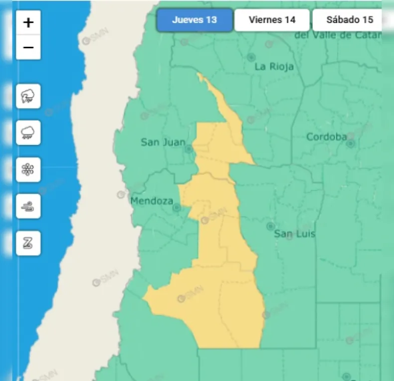 El Servicio Meteorológico Nacional (SMN) informó una alerta amarilla por tormentas para el jueves 13 de noviembre, que afecta a los departamentos de 25 de Mayo, Angaco, Caucete, San Martín y Valle Fértil en el este de San Juan.