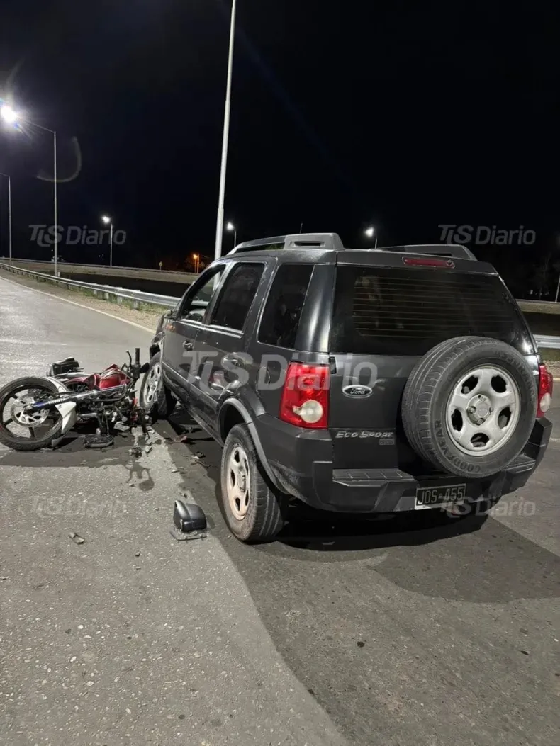 El impacto fue de gran magnitud, dañando seriamente la moto Yamaha FZ 160cc y la rueda delantera izquierda de la camioneta. Heredia sufrió heridas en el cráneo y golpes en el cuerpo, por lo que fue trasladado en ambulancia al Hospital Rawson, donde permanece internado en observación.