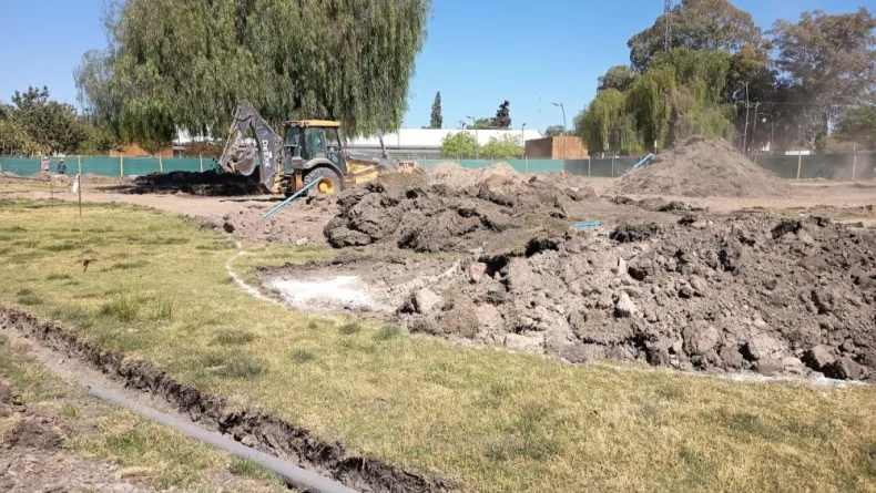 Los trabajos ya realizados incluyen la delimitación del área, traslado del sistema de riego, reubicación del cableado subterráneo para la futura iluminación con cinco torres perimetrales, y la preparación del suelo con base para la instalación del piso de caucho. El sector destinado a juegos está claramente definido, evidenciando un avance significativo en la obra.