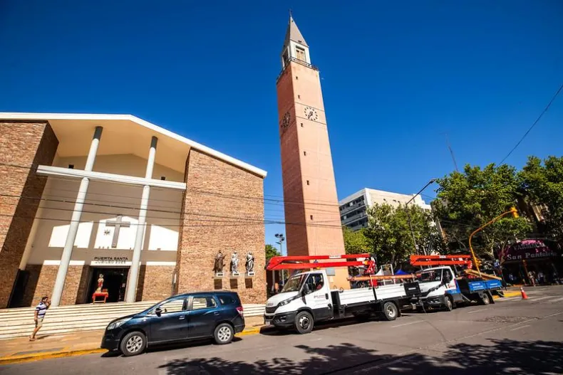 La Municipalidad comenzó la instalación de seis mangueras luminosas en cada una de las cuatro caras del Campanil, utilizando luces LED de alta calidad para reforzar el ambiente festivo en la ciudad.