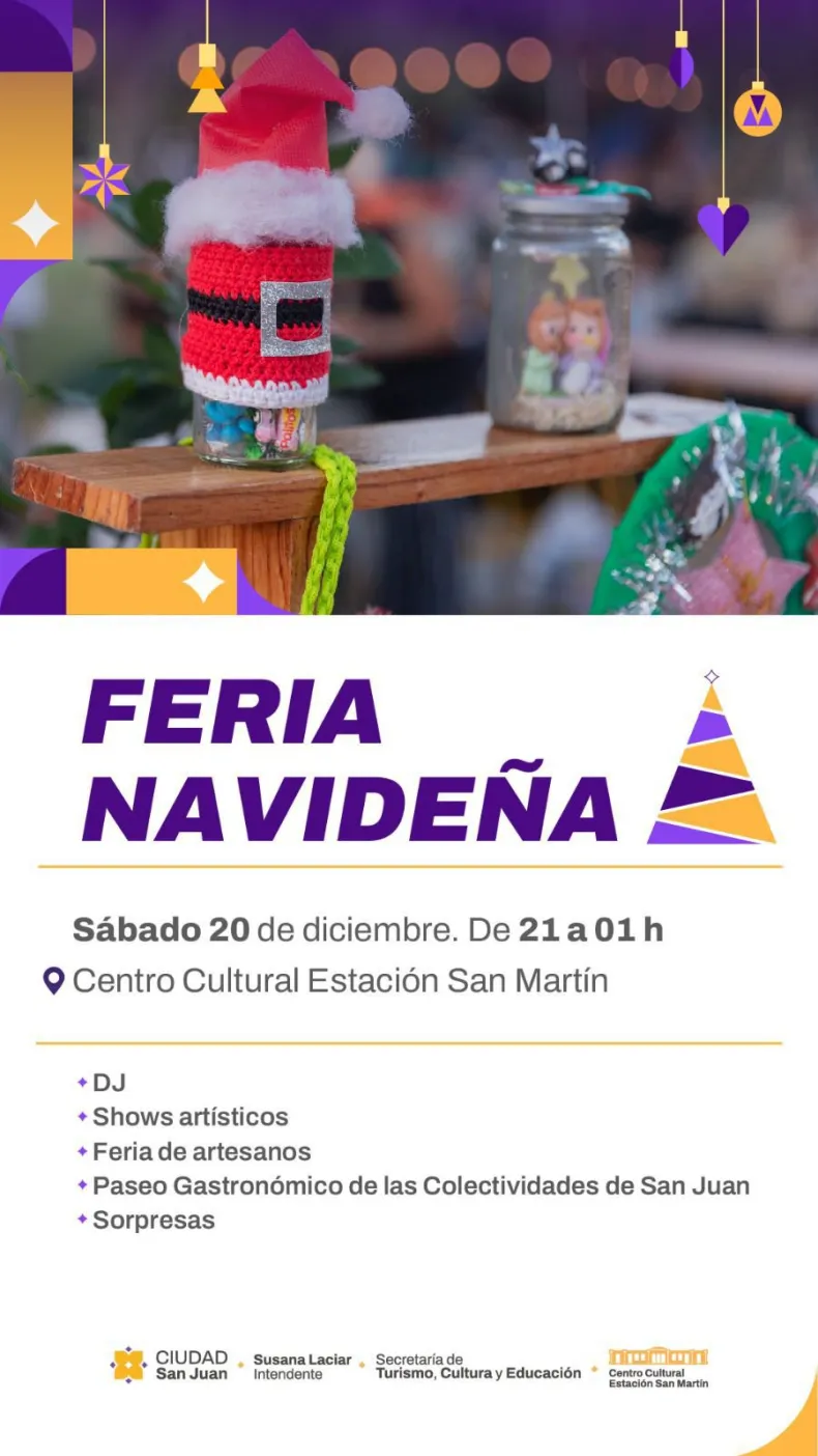 La Municipalidad de San Juan invita a disfrutar una propuesta cultural, artística y gastronómica para toda la familia en la Feria Navideña que se realizará el sábado 20 de diciembre.