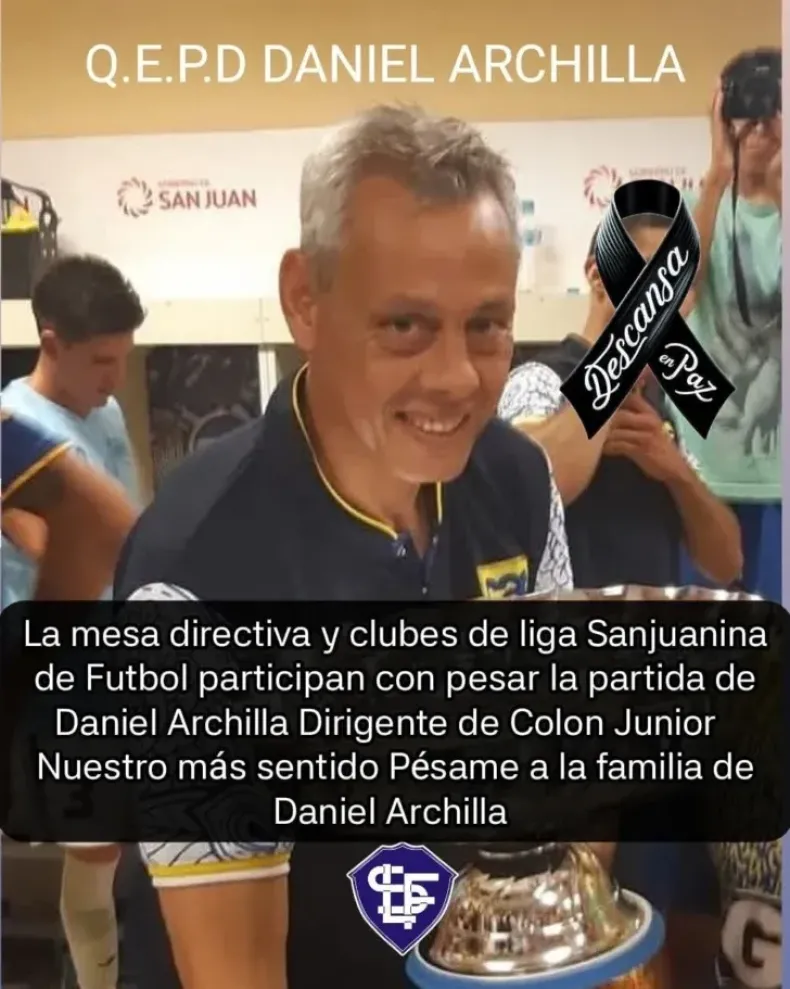 La Liga Sanjuanina de Fútbol expresó su profundo pesar mediante un comunicado en redes sociales: "La mesa directiva y los clubes de la Liga Sanjuanina de Fútbol participan con dolor la pérdida de Daniel Archilla", acompañando el mensaje con una imagen alusiva al duelo.