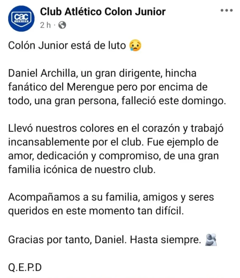 Por su parte, desde Colón Juniors, club con el que Archilla estuvo estrechamente vinculado durante años, lo recordaron con gran afecto: "Un gran dirigente y fanático incondicional del Merengue. Por encima de todo, una persona extraordinaria", resaltaron, destacando su dedicación constante, compromiso con la institución y el legado imborrable que deja en la comunidad deportiva sanjuanina.