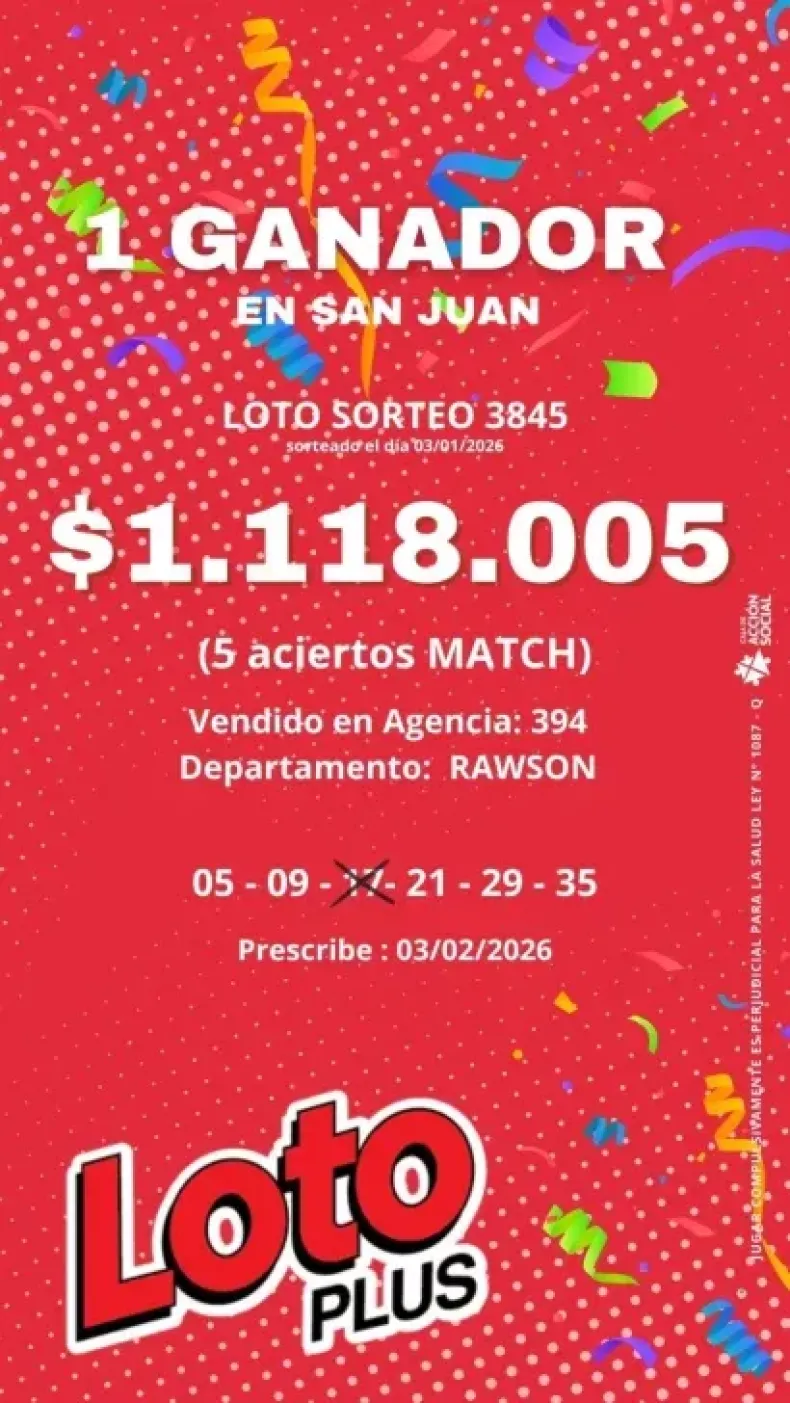 En el sorteo de Loto realizado el sábado 3 de enero, un apostador obtuvo un premio de $1.118.005 en la modalidad Match. Los números favorecedores fueron 05 – 09 – 17 – 21 – 29 – 35. La jugada se efectuó en la agencia N°394 de Rawson. El ganador tiene hasta el 3 de febrero para reclamar su premio.