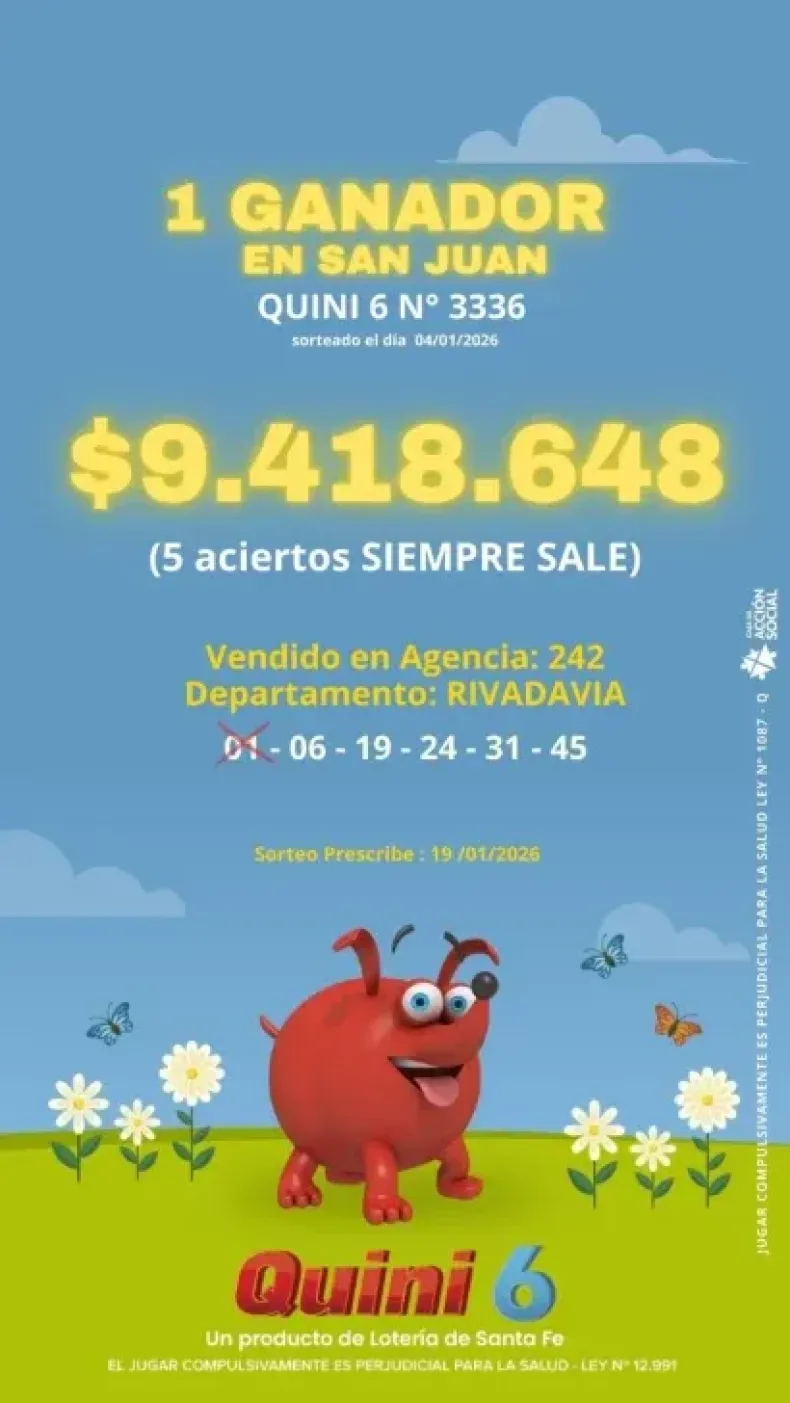 Por otro lado, un jugador que participó en el sorteo de Quini 6 del domingo 4 de enero, consiguió un premio de $9.418.648 tras acertar los números 01 – 06 – 19 – 24 – 31 – 45 en la modalidad Siempre Sale. La jugada fue realizada en la agencia N°242 de Rivadavia. El premio deberá ser reclamado antes del 19 de enero.