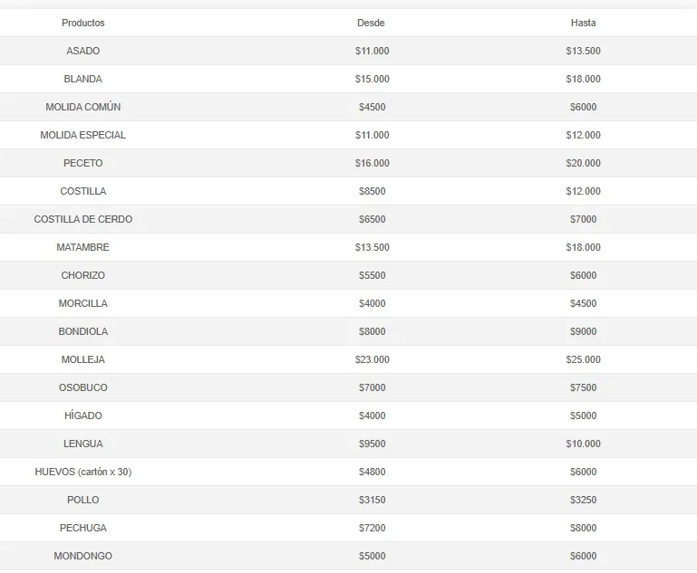 En el sector carnes, se mantienen los precios de referencia para cortes populares: el asado entre $11.000 y $13.500, la carne molida común desde $4500, el pollo alrededor de $3200 y la milanesa de carne entre $8000 y $9500. También se pueden encontrar productos de cerdo, achuras y embutidos con precios competitivos.