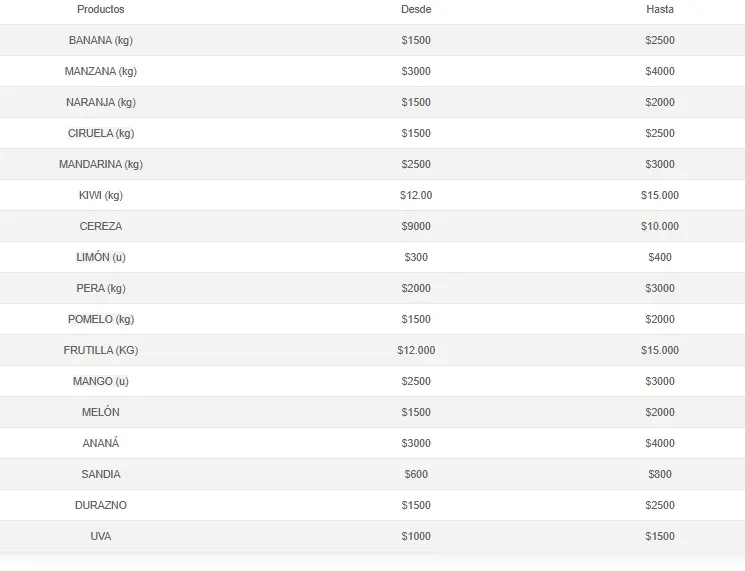 Respecto a las frutas, la oferta incluye banana desde $1500 el kilo, naranja entre $1500 y $2000, sandía desde $600 y uva entre $1000 y $1500. Se suman productos de temporada como duraznos, ciruelas, melón y frutilla cuyos precios varían según calidad y origen.