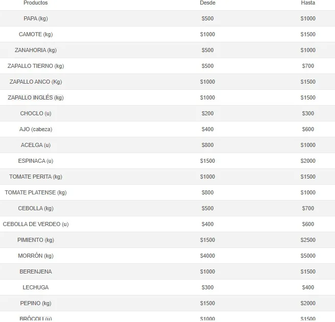 En el sector de verduras, se destacan productos básicos con valores competitivos: la papa desde $500 el kilo, la zanahoria entre $500 y $1000, la cebolla desde $500 y la lechuga a partir de $300. El tomate perita se consigue entre $1000 y $1500, mientras que el zapallo tierno varía entre $500 y $700.