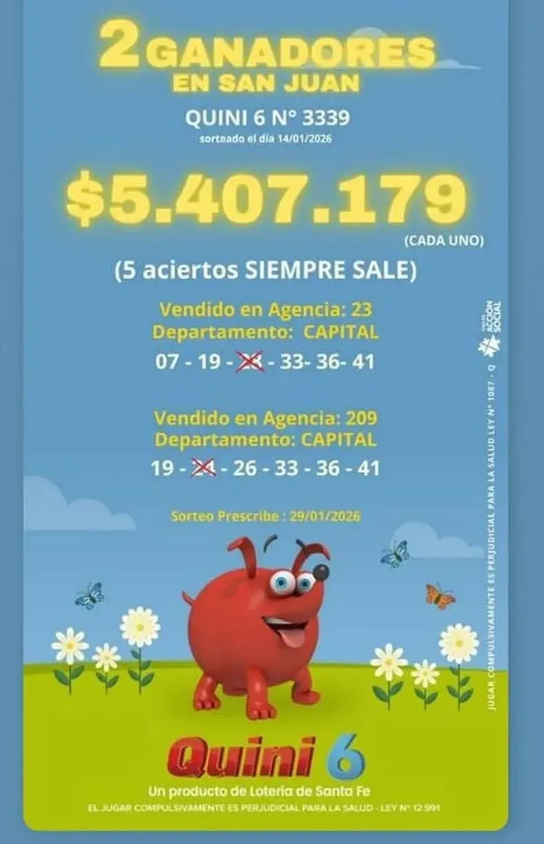 San Juan festeja doble: dos apostadores ganaron más de $5 millones en el Quini 6