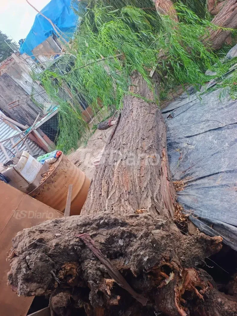 Durante la tarde de este viernes, un fuerte episodio de viento en Santa Lucía provocó la caída de un sauce centenario sobre una vivienda ubicada en la calle Candallo s/n, en el barrio Villa 12 de Octubre. El incidente ocurrió alrededor de las 19:30, cuando ráfagas intensas del cuadrante sur derribaron el árbol, que tenía aproximadamente 50 años.
