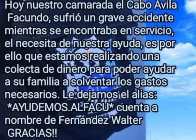 Facundo Ávila, efectivo de 27 años, permanece internado en el Hospital Rawson tras un accidente con un micro de la Red Tulum. Su familia solicita oraciones por su recuperación debido a la gravedad de sus lesiones.