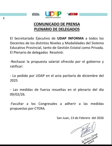 Además, mediante un comunicado, UDAP dejó abierta la posibilidad de sumarse a eventuales medidas nacionales que disponga CTERA, lo que podría ampliar el alcance del conflicto.