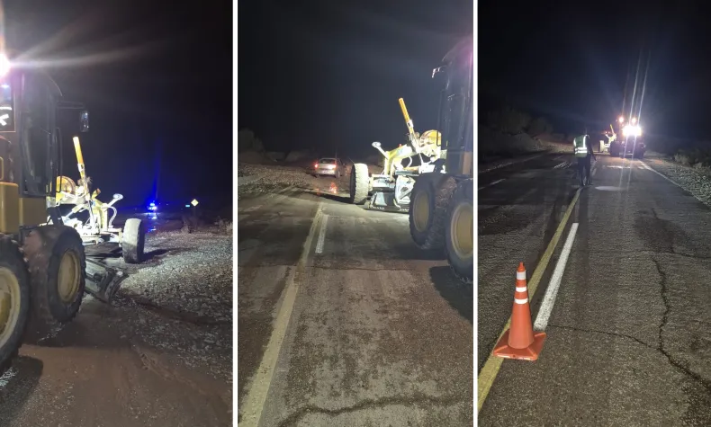 Las tareas se desarrollan bajo condiciones de lluvia persistente y continuarán durante toda la noche y la mañana del martes, con maquinaria vial operando directamente sobre la calzada. Desde el organismo indicaron que el objetivo es garantizar la transitabilidad y minimizar riesgos ante la presencia de agua y material de arrastre en distintos sectores.