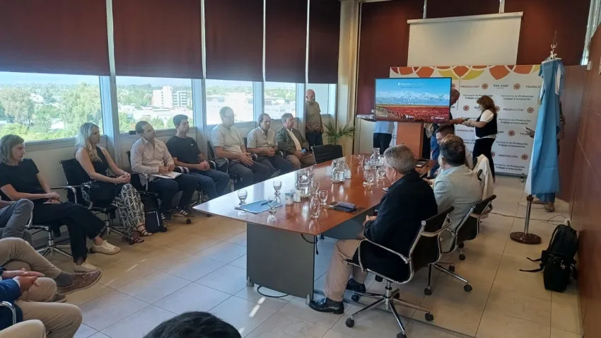 El secretario de Coordinación para el Desarrollo Económico, Alfredo Aciar y el director de Comercio Exterior, Adrián Alonso recibiero a Patricia Giménez, gerente de Fundación ProMendoza y presidente de Unidad ProMendoza, José Bartolucci, presidente de la Cámara de Vino a Granel, Juan Palomo, Gerente de la Cámara de Vino a Granel y Javier Rojas, responsable de Vino Fundación ProMendoza. Además, estuvieron presentes el director de Desarrollo Vitivinícola, Juan Carlos Hidalgo, el director de Contingencias Climáticas y Registro Productor, Alberto Gallardo y representantes de 24 bodegas sanjuaninas.