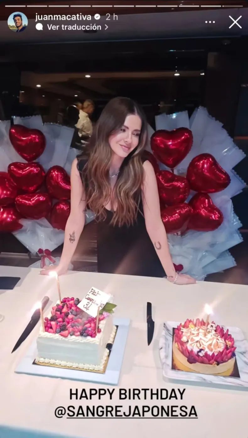 La primera foto de la celebración fue publicada por su amigo y estilista, Juan Manuel Cativa, quien subió una historia a su cuenta de Instagram. En la imagen se ve a la actriz frente a una mesa con dos tortas y rodeada de globos rojos con forma de corazón.
