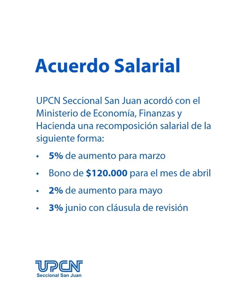 El sindicato UPCN Seccional San Juan confirmó un acuerdo con el Ministerio de Economía que incluye incrementos salariales en marzo, mayo y junio, junto a un bono excepcional en abril y una cláusula de revisión a mitad de año.