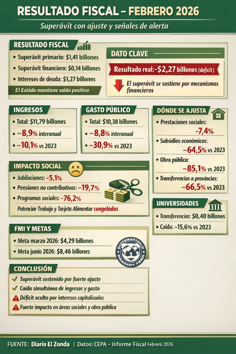 El Sector Público Nacional volvió a registrar superávit en febrero de 2026, pero con una señal cada vez más clara: el equilibrio fiscal se sostiene sobre un fuerte ajuste del gasto, que tiene como uno de sus puntos más críticos la caída de las transferencias a las provincias.