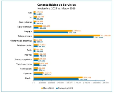 El costo de la canasta de servicios para una familia de clase media alcanzó en marzo de 2026 los $2.980.339 mensuales, reflejando un aumento del 22,25% respecto a noviembre de 2025. Este incremento responde principalmente a la actualización de tarifas y al ajuste de precios en sectores rezagados.