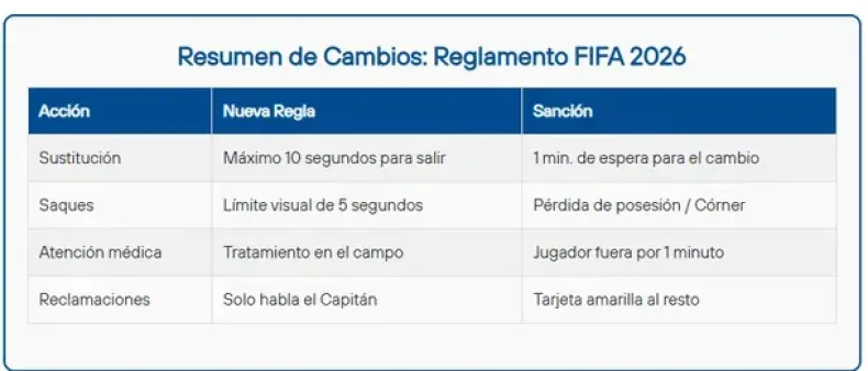 La entidad rectora del fútbol confirmó que las nuevas disposiciones comenzarán a regir en la próxima Copa del Mundo. Según lo informado, las medidas buscan elevar el tiempo efectivo de juego y limitar conductas que suelen frenar el desarrollo de los partidos, como las sustituciones demoradas, las protestas reiteradas y las reanudaciones lentas.