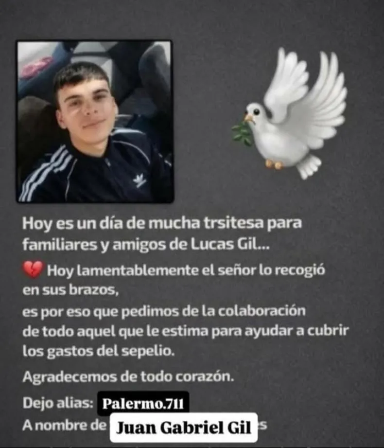Luego de confirmarse la muerte de Lucas Maximiliano Gil Saavedra, familiares y amigos difundieron una campaña solidaria para reunir dinero destinado a cubrir los gastos del sepelio. La convocatoria comenzó a circular este viernes por redes sociales, con pedidos de colaboración para atravesar la situación.