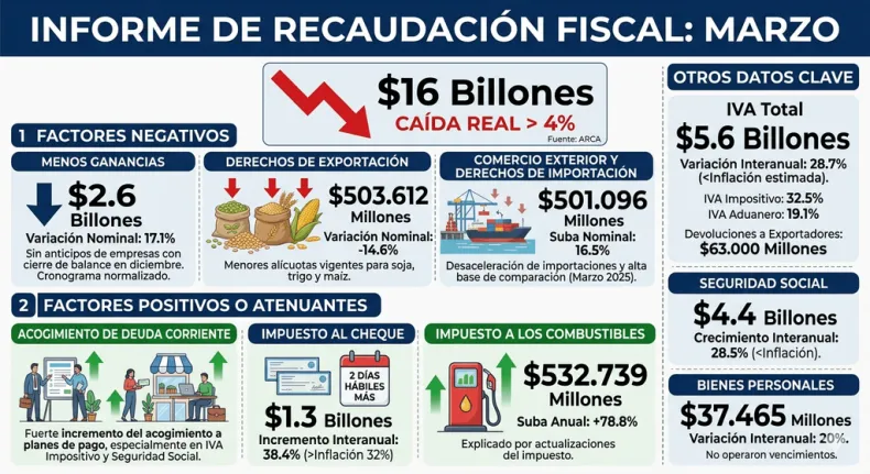 La recaudación fiscal de marzo totalizó $16 billones y mostró una baja de algo más de 4% real, de acuerdo con la información difundida este miércoles por la Agencia de Recaudación y Control Aduanero (ARCA). En la comparación interanual, los ingresos avanzaron 26,2% en términos nominales.