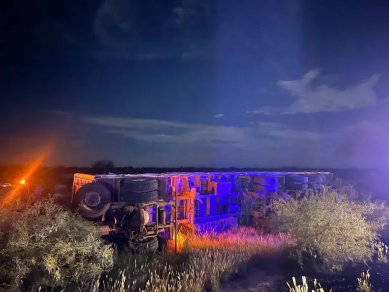 El siniestro se produjo de madrugada en el departamento 25 de Mayo, cuando un transporte de gran porte perdió estabilidad al intentar detenerse en la banquina. El chofer, de 34 años, logró salir por sus propios medios y recibió asistencia por un corte menor en una oreja.