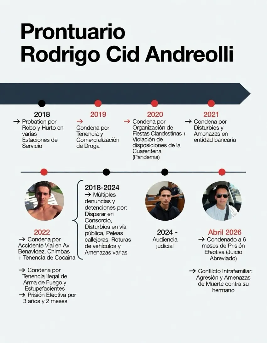 Rodrigo Cid Andreolli fue condenado el pasado lunes a 6 meses de prisión efectiva tras admitir agresiones y amenazas contra su hermano. Su historial judicial se remonta a 2018.