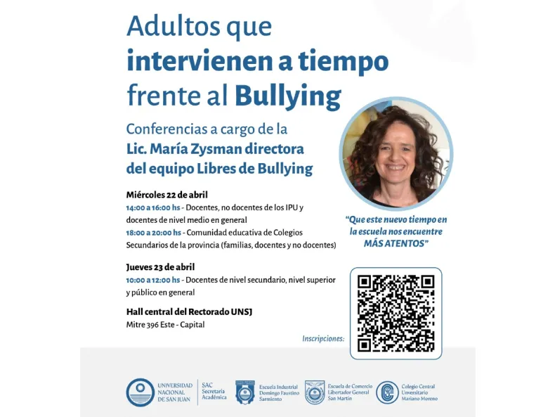 La Universidad Nacional de San Juan, junto con su Secretaría Académica y los institutos preuniversitarios, organizará una serie de conferencias sobre la problemática del bullying bajo el lema "Adultos que intervienen a tiempo frente al Bullying". La actividad contará con la participación de la licenciada María Zysman, directora del equipo Libres de Bullying, y se realizará los días 22 y 23 de abril en el salón central del edificio principal de la universidad, en Mitre 396 Este, Capital.